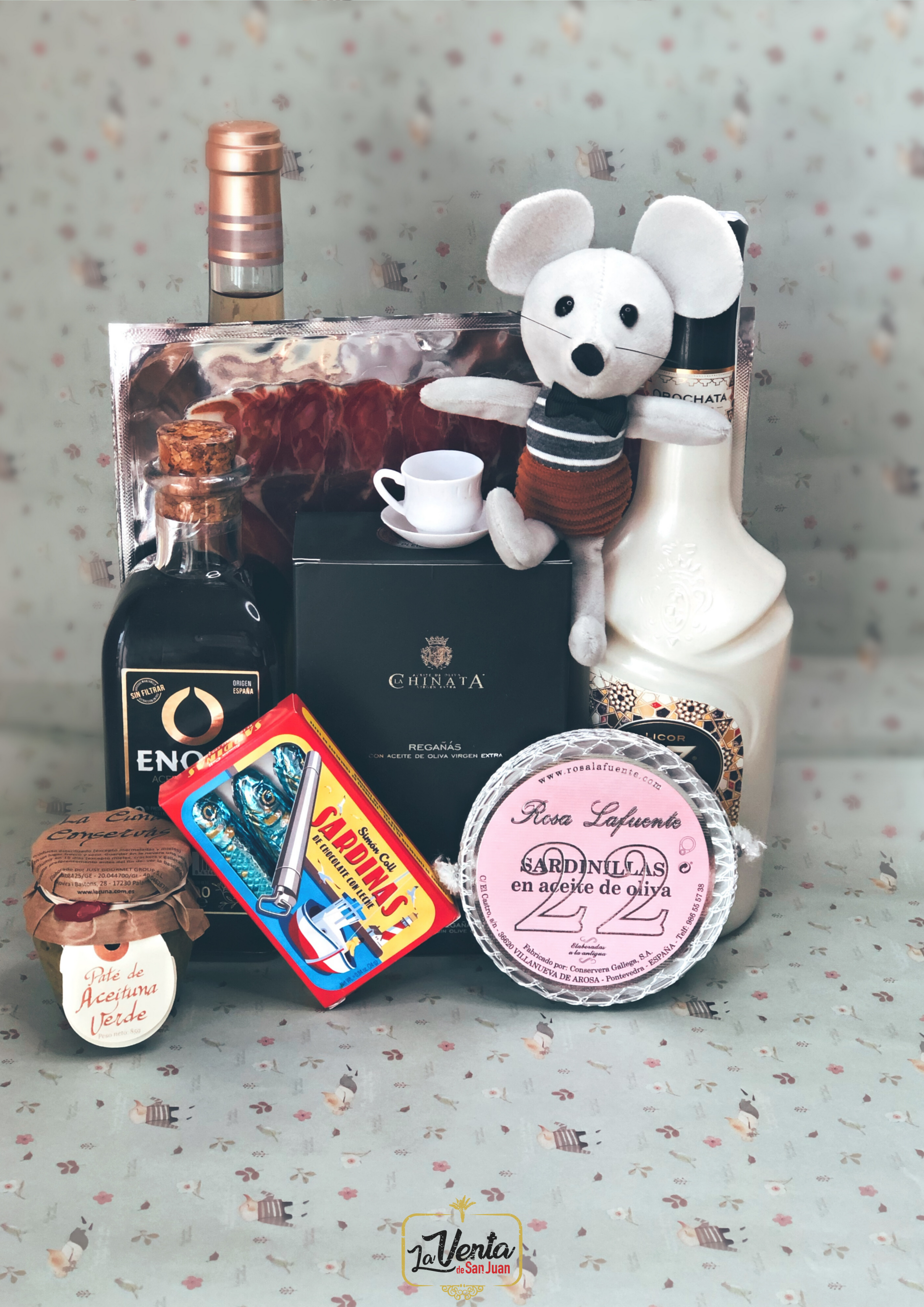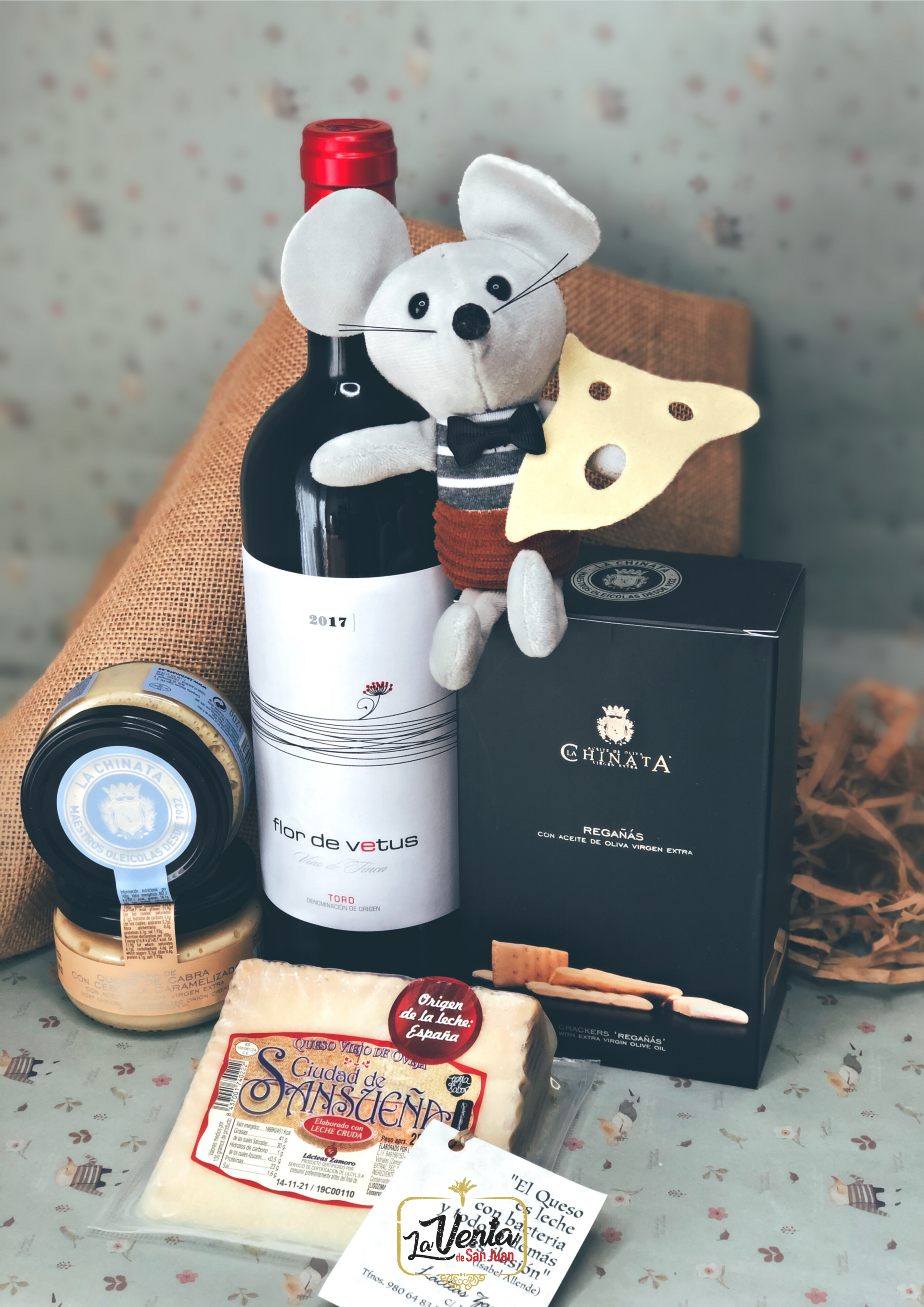 1ud. VINO DO española, 1ud. Cuña de queso viejo Sansueña oveja, 1ud. Picos o regañás, 2uds. cremas queso la Chinata, 1 ratoncito, Mensaje y Cajita vintage "Pequeños valientes". (+4€ Saco ó Cesta)