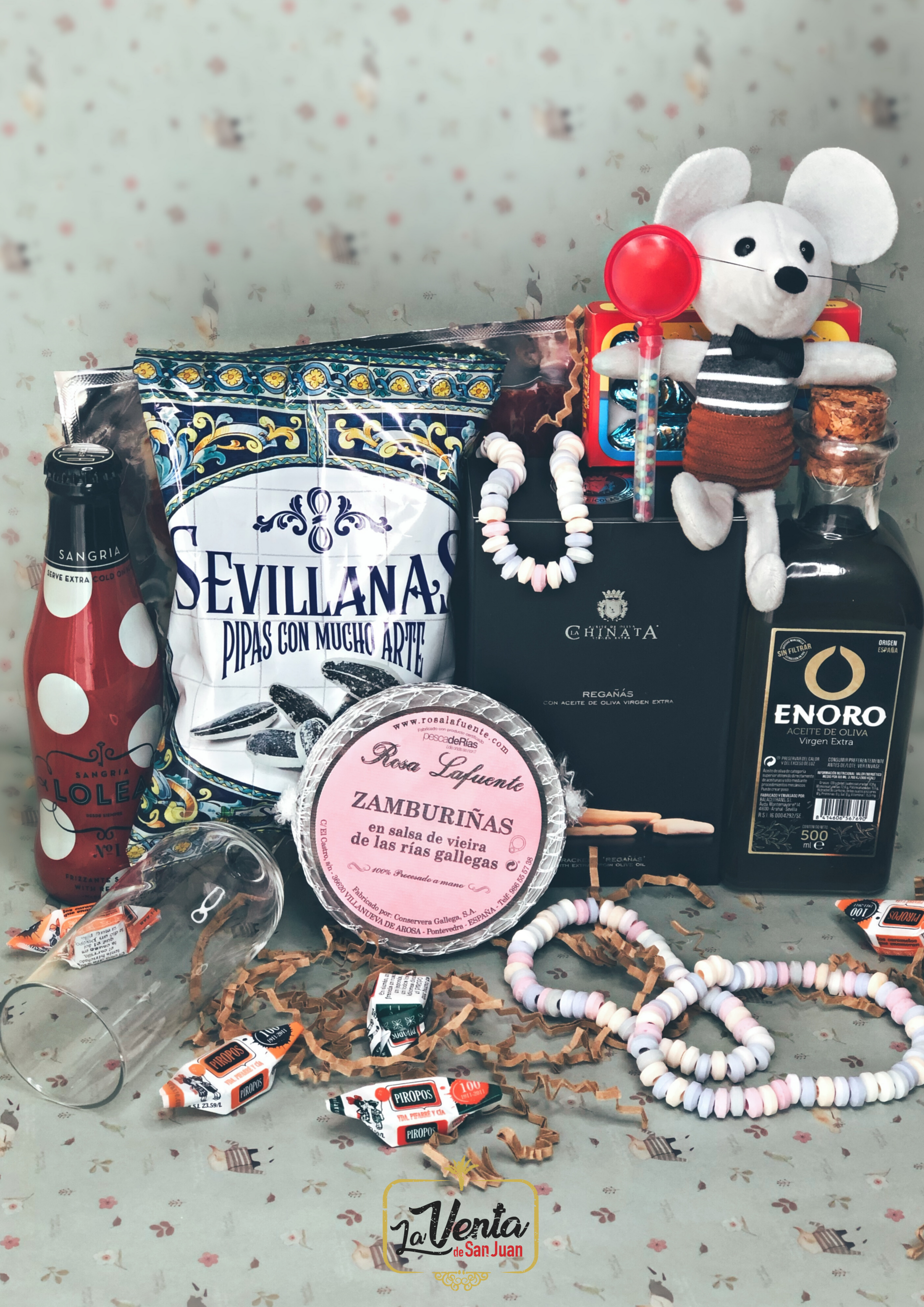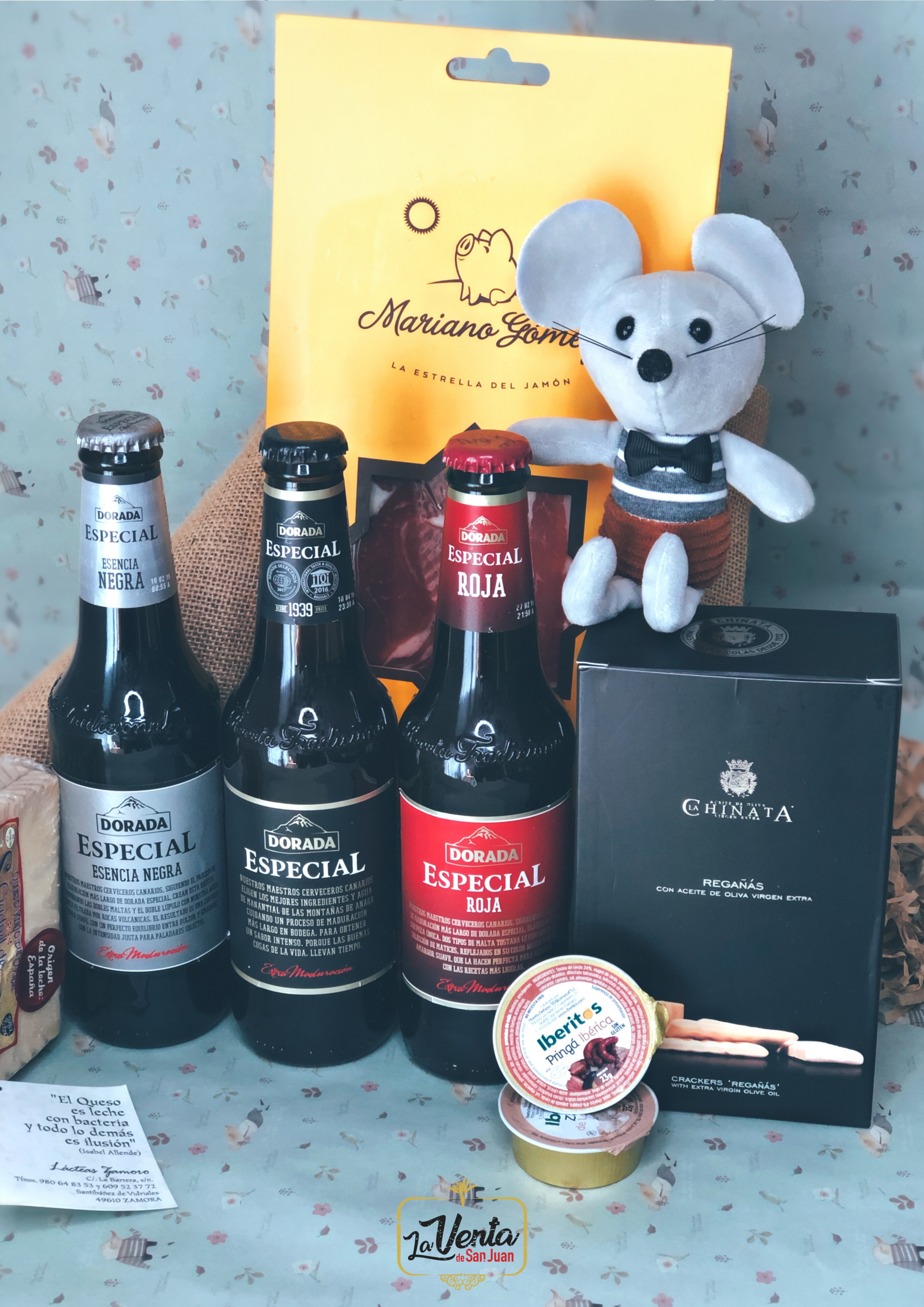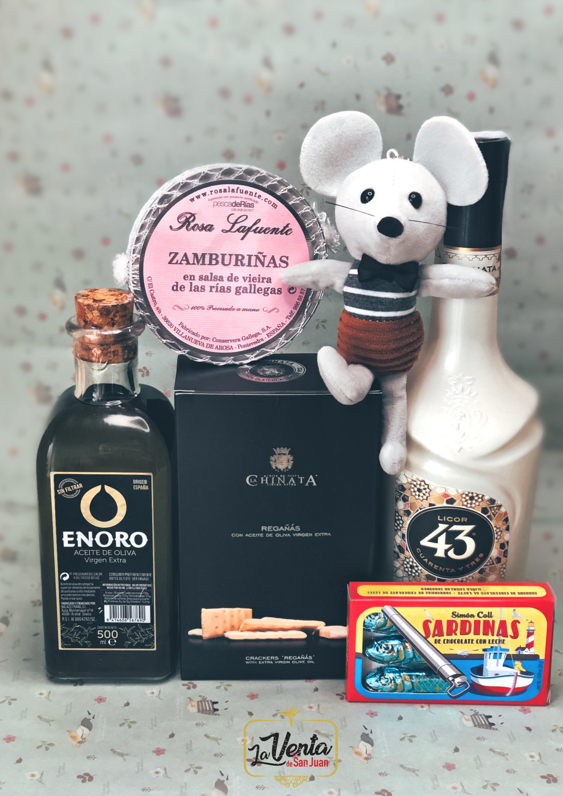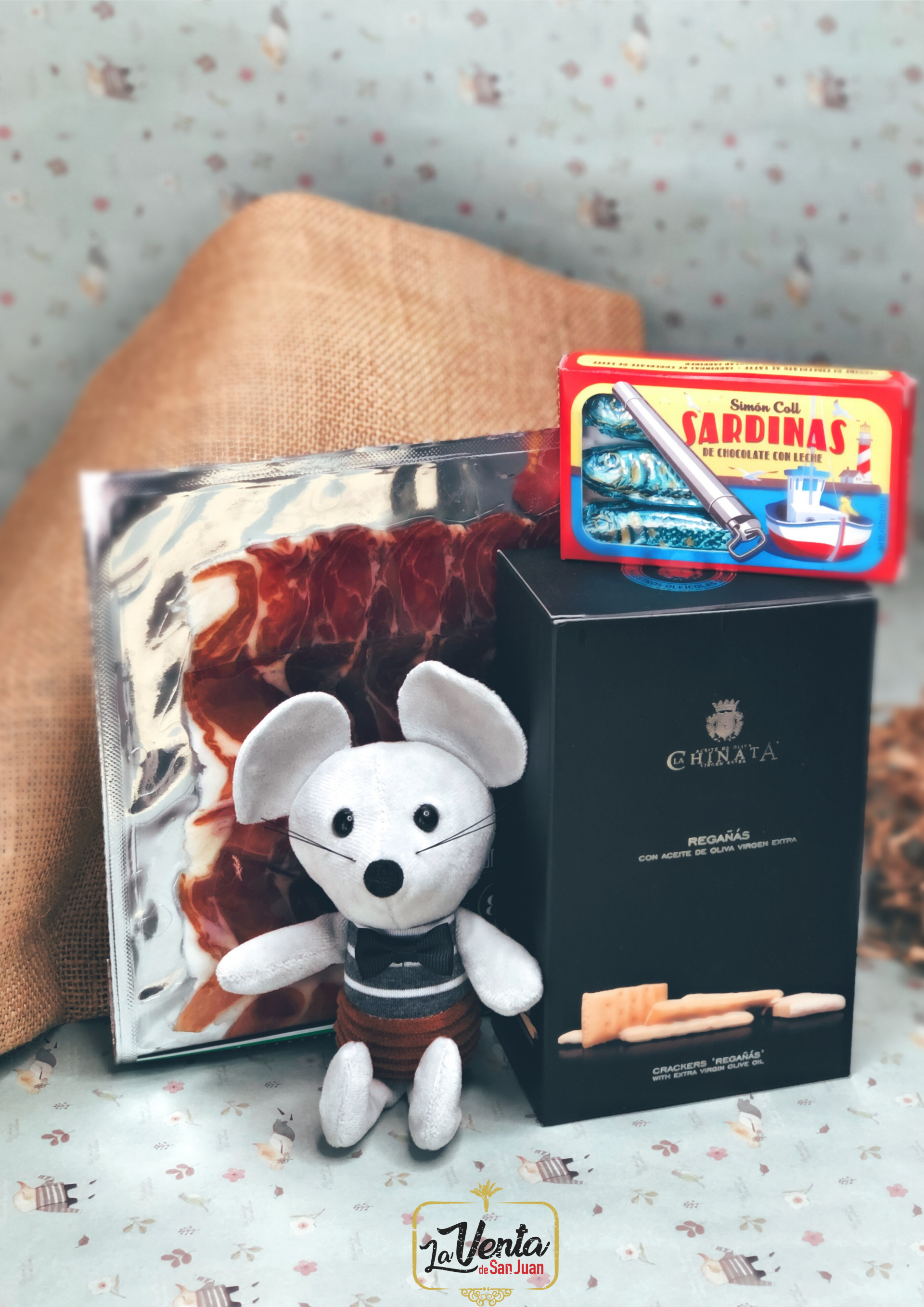 1ud. VINO DO española, 1ud. Cuña de queso viejo Sansueña oveja, 1ud. Picos o regañás, 2uds. cremas queso la Chinata, 1 ratoncito, Mensaje y Cajita vintage "Pequeños valientes". (+4€ Saco ó Cesta)